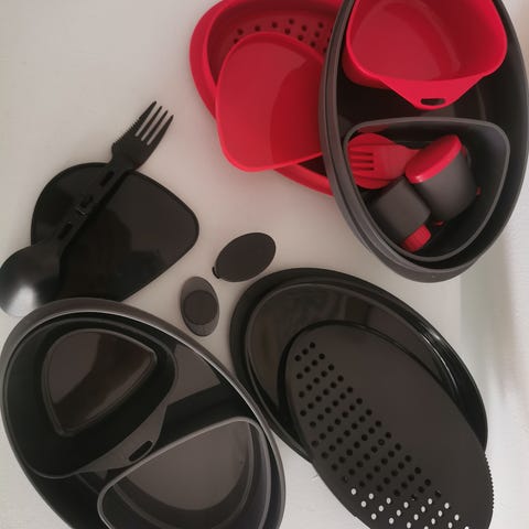 Primus tallerken, kop, skærebræt, spork, krydderibøtte, oliebøtte, bøtte - alt samlet i en større primus bøtte. Smart, praktisk og letvægtig udstyr til turen.
