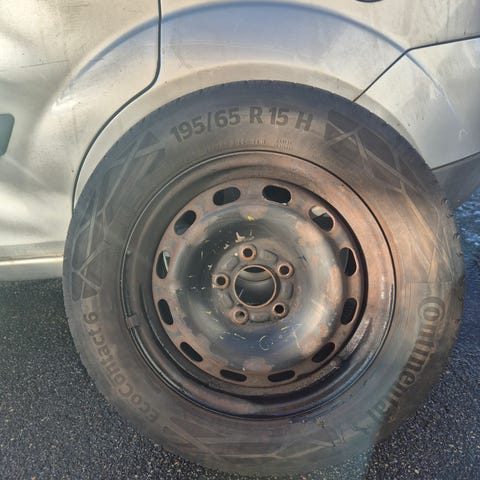 Begge dele er ubrugte, og er super fine (dog en lille smule rust på fælgen (se billede). Sættet har en del år på bagen, da hjulet har ligget som reservehjul i en Ford Focus fra 2004. Så vidt jeg ved, har det ligget der altid, altså fra bilen var ny, og har derfor sandsynligvis samme alder som bilen!