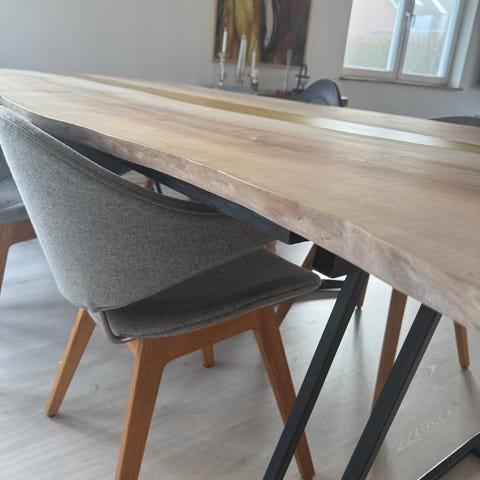 Håndlavet plankebord i massive planker i gran træ, olieret i valnød og lakeret efter.