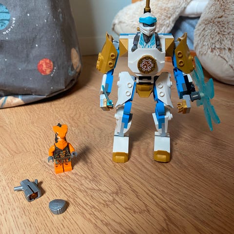 Lego Ninjago, Jeg vil sælge min seje ninjago power robot det er zains power robot den har to arme et sværd i det ene og et roterende stjernevåben i det andet