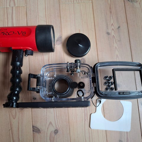 Ewa-marine U-BXP100. Har kun været brugt én enkelt gang på ca 12m (Egypten). Kan bruges ned til 50m dybde. Passer til de fleste SLR/DSLR kameraer og der er også plads til Flash. Objektivomkreds: 55-72mm. Nypris er ca 2.850kr