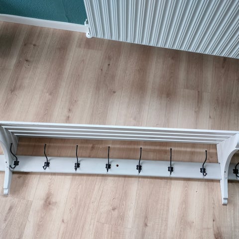 Hvidmalet træ og knager i messing. Har et par skrammer. Kald det patina eller giv den en klat maling.