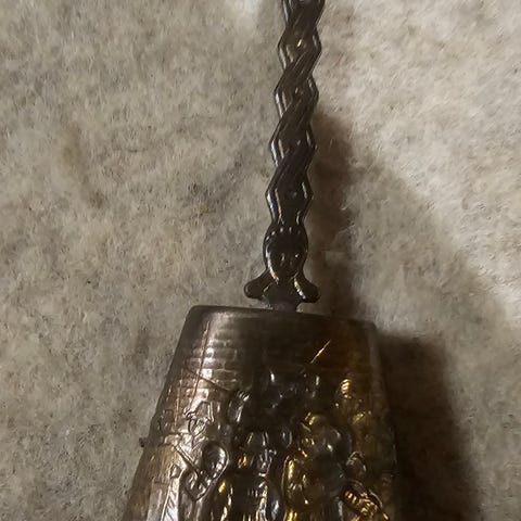 Ske, 80 år gl., b: 17 d: 5 h: 2, Sølv ske med huller i. Er fra mine oldeforældres tid. Der er to tårne bagpå.