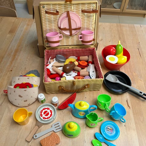 Meget smuk vintage picknick kurv til hyggelig børne leg. Flet i håndtaget er gået lidt i stykker. Kæderne er gået i stykker men har ingen praktisk betydning