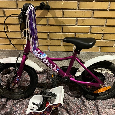 Fin lille pigecykel i god stand. Støttehjul medfølger og kan nemt monteres. Vi har købt den fra ny til vores datter og den har været god til at lære at cykle på.