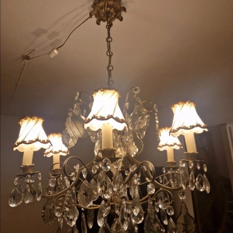 Komplett och fulltfungerande. Tung,vägger över 20kg . Stora böhmiska kristallprismor. Kan hämtas I Helsingör eller Kvistgård.
