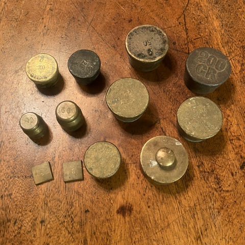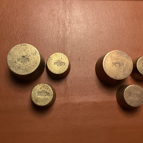 Antikke patinerede messing lodder 3 stk 200gr, 1 stk qvint, 1 stk. 50gr. 2 stk. 20 gr. incl. træholder