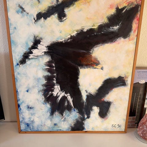 Et flot maleri på sort platte af gråspurve i træer.