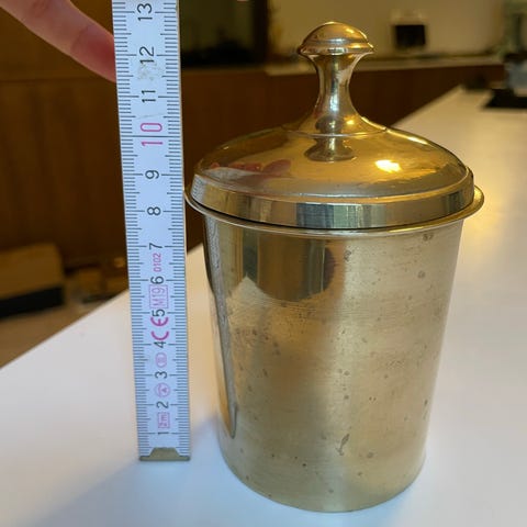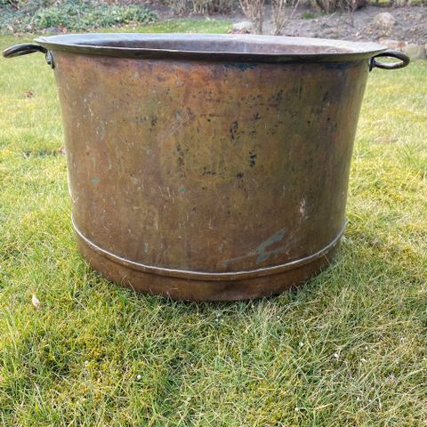 Messing balje med håndtag. Baljen er lavet af messing og har et solidt håndtag, der gør den nem at bære. Den er ideel til dekorative formål eller praktisk brug i hjemmet, såsom opbevaring af garn, puder, tækker eller brænde. Baljen har en klassisk messingfinish, der tilføjer et rustikt udseende.