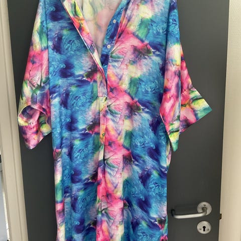 Den er ny og ubrugt. Meningen er at den kan bruges som sommerlig kjole / kaftan og fx tage den på til stranden så du kan skifte fra badetøj til tørt eller blot gå rundt og nyde sommerlivet i let og åndbart tøj.