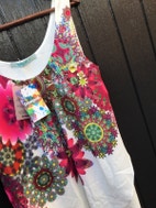 Den smukke Desigual kjole sommerkjole har det skønneste multifarvede blomster og mandala mønster i friske klare farvet i pink cerise gul grøn turkis mm. Den har påsyede blomster med similisten samt broderet Desigual logo i guld bagpå. Kjolen er i 2-lag, således den ikke er gennemsigtig.