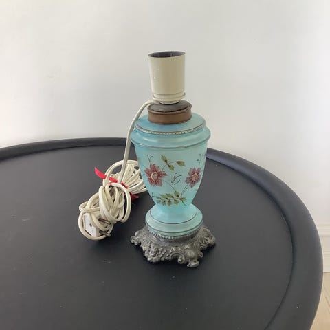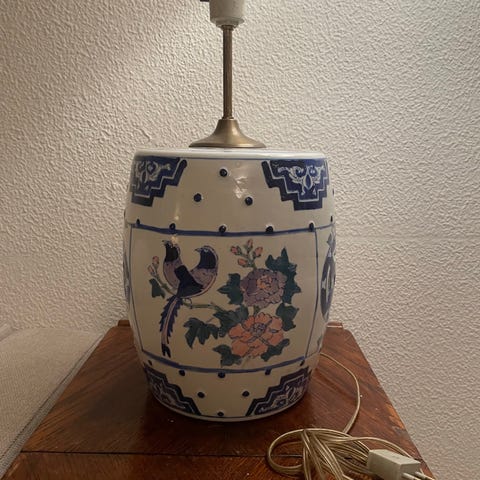 Sjov og anderledes lampe med 4 røde æbler på. Lampen er ca. 40 år gammel og desværre er skærmen i stykker. Dog bør det være enkelt og billigt at få fremstillet en ny. Har afbryder på ledningen.