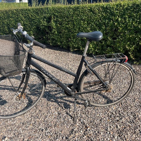 Ældre kvalitetscykel, 3 gear, punkteret på forhjul, dæk trænger til udskiftning
