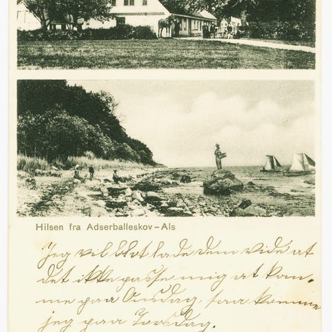 Gruss aus Atzerballigholz. Postkort fra Asserballeskov med motiver fra Hygebjerg, Fynshav og et gademotiv. Poststempler fra Fynshav 12.12.1907 og Tandslet. Sendt til Lebøl. Kort i god stand.