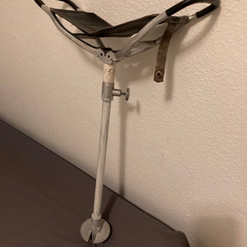 Fed sammenklappelig 3-benet jagtstol/taburet i metal og kernelæder. Siddehøjde 51 cm.