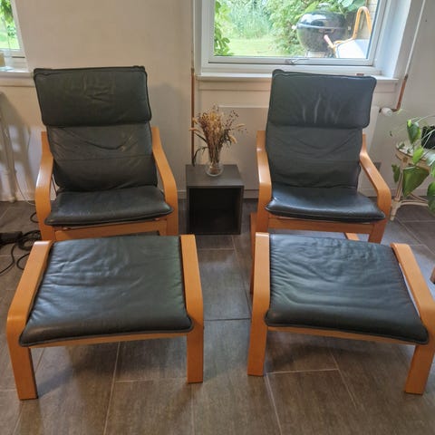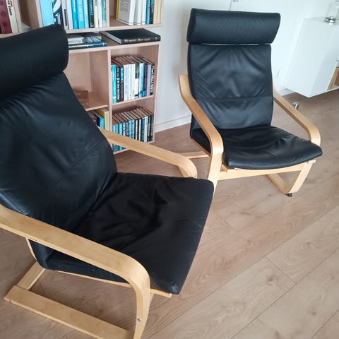 Fin Poäng lænestol i sort læder og formspændt egefiner med god fleksibilitet og rigtig god siddekomfort.