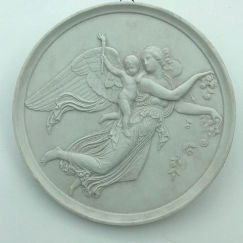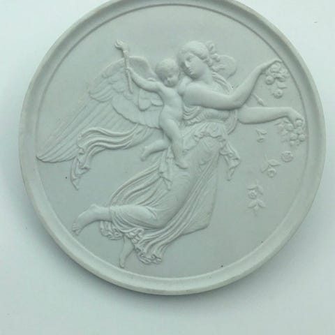 Bertel Thorvaldsen: Bing og Grøndahl Biscuit Platte Dagen. Kopi fra 1840 after Thorvaldsens original fra Rom 1815. Måler 28,5cm (11.22 inch). Fremstillet i slutningen af 19. århundrede.