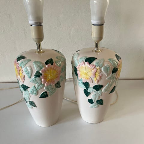 Smuk,enkel lampe med en svungen stang og en firkantet hvid lampeskærm med sorte franske liljer på. Den er ca 20 år gammel men har kun få brugsspor.