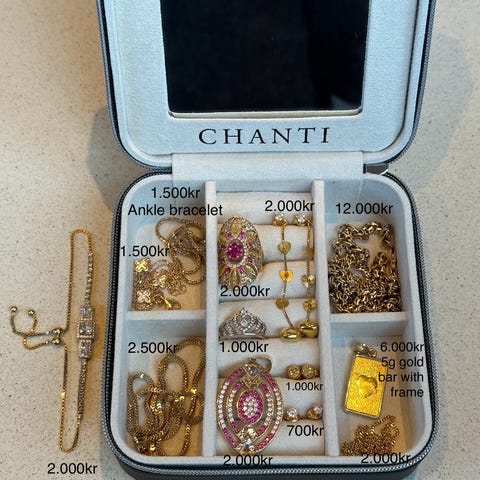 Grundled Scarlett smykkesæt, bestående af ring, armbånd, øreringe og halskæde alt sammen forgyldt i 18 karat guld.