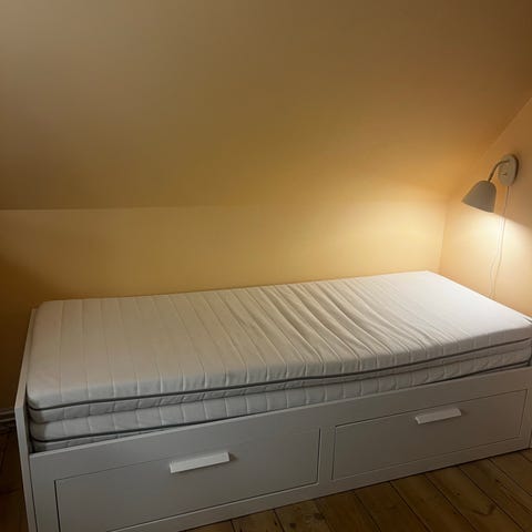 Helt velfungerende seng ude nogle skader. Kan trækkes ud til to senge. Skuffer under som virker helt perfekt.
