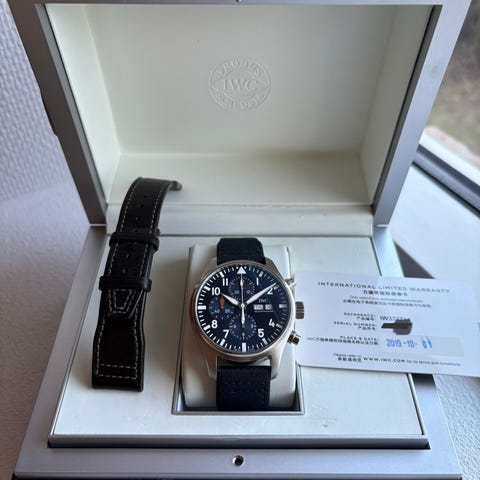 Funktioner: tid, dato, kronograf med fly-back funktion, in-house værk, skruekrone, glasbagside. Vandtæt 100 meter. Sort (ikke blå) skive. 45,5 mm. Monteret med sort læderrem med IWC-foldespænde (tilkøb). Originalt spænde medfølger (sælges ikke separat). Alle papirer og bokse (både inder- og yder) medfølger. Købt maj 2010 i DK. Nypris ca. 95.000 kr. inkl. foldespænde.