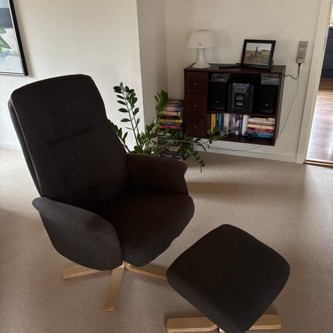 To lænestole fra Bernstofminde A/S i sæbebehandlet bøg med fodskammel og nakkestøtte. Betræk i uld.
