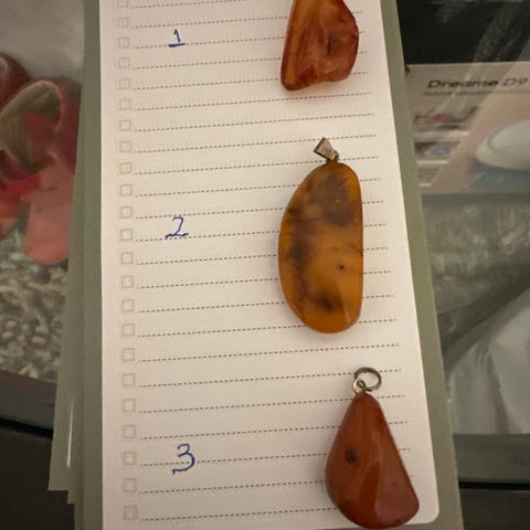 Gyldent rav-vedhæng monteret i sølv (925), kæden er ikke sølv. Forskellig mønstre på de to sider