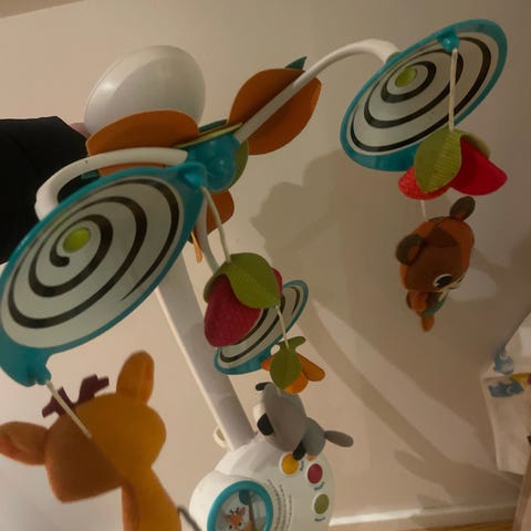 Dyrene drejer langsomt rund, spiller forskelligt musik. Uro delen kan tages af bruges, så musik delen kan bruges alene når barnet bliver større