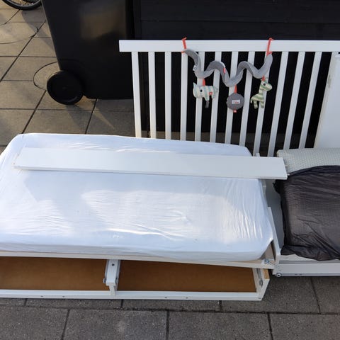 Hvid barneseng 70 x 140 cm. Lameller følger med, men ingen madras. Kan afhentes efter aftale ved sommerhus i Holløselund, Nordsjælland.