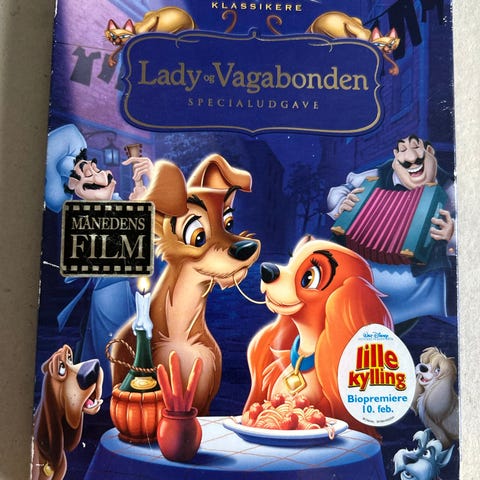 Uåbnet Disney tegnefilm på dvd, Lady og Vagabonden med dansk, norsk og engelsk tale. Tekstet på dansk, norsk og engelsk.