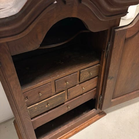 Smukt træskab til salg. Svært at aldersbestemme men har tilhørt familien i mere end 100 år. Har været brugt som medicinskab i mit barndomshjem. Selve skabet måler 41 cm i højde, 30 cm i bredde og 16 cm i dybden. Med fronten er målene 61 høj og 35 bredt. På front sidder en udskåret firkant som er låsen. Har nogle huller i bagvæggen som er knaster der er faldet ud gennem årene.