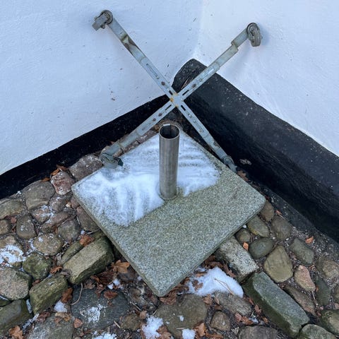 str 50 x 50 cm har været brugt til parasol og har samtidigt været brugt til fastgørelse af læskærme. - Deraf de 2 x 2 borede huller i 2 sider.