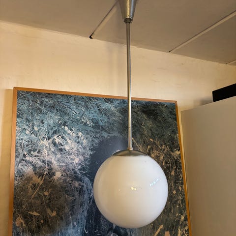 Diametter 25 cm. Opal mundblæst glas, krom fatning.
