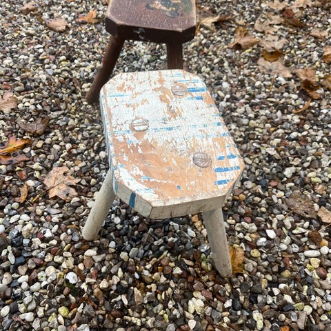 2 retro skamle/sengestole. Mørk træ med blåt stof. Skal ompolstres. Med buede ben.