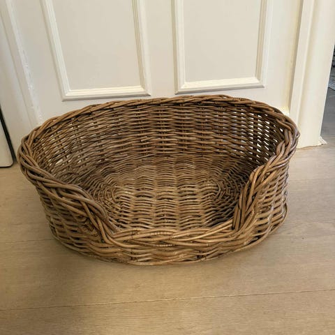 Hundekurv. 100% håndflettet rattan med runde rør og uden skarpe kanter. Størrelse: Large. Se mål på et af billederne. Betrækket kan vaskes ved 30 grader.