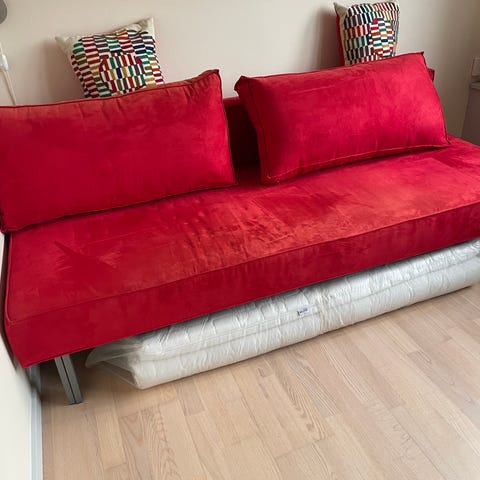 Rød sovesofa sælges - Til afhentning (Køber står for transport - Den står på 1. sal) - Alternativt kan den købes for 50 kroner mere, hvor den stilles ved hoveddøren