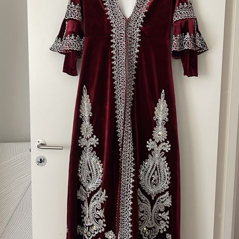 Todelt: kjole (satin og velour) + kappe (velour)