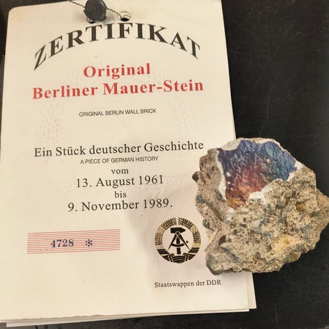 Sælger disse 2 stykker af Berlin muren, som er købt året efter dens fald, Så hvis du er samler af historiske ting, så bør dette lige være noget for dig, 295 for begge stykker. Da det er en skrøbelig ting er afsendning kun en mulighed hvis køber tør at tage chancen, vil selvfølgelig blive pakket pænt ind i bobbleplast, men kan jo ikke garentere hvordan postbudet håndtere pakken. Derfor foretrækker jeg afhentning
