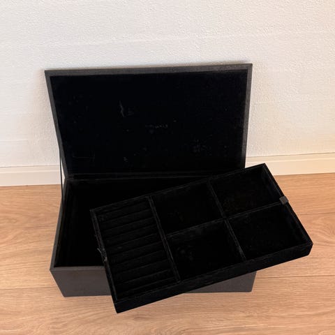 Sort smykkeskrin fra Mojoo. Måler 33x19x10,5 cm. Meget god stand. Ny pris er 900 kr.
