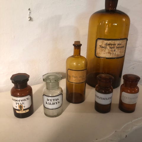 Ca 6 cm høje apoteksflasker fra dengang farfar var dreng.