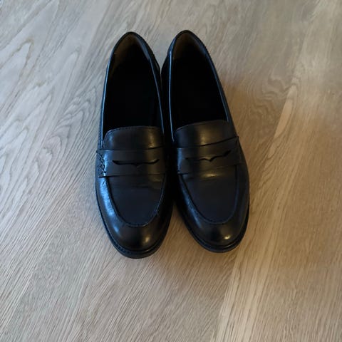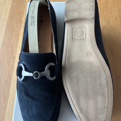 Sorte loafers af mærket Tamaris, med et slangeskindslook, spids snude og en lille blokhæl på ca. 2 cm.