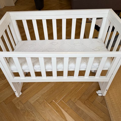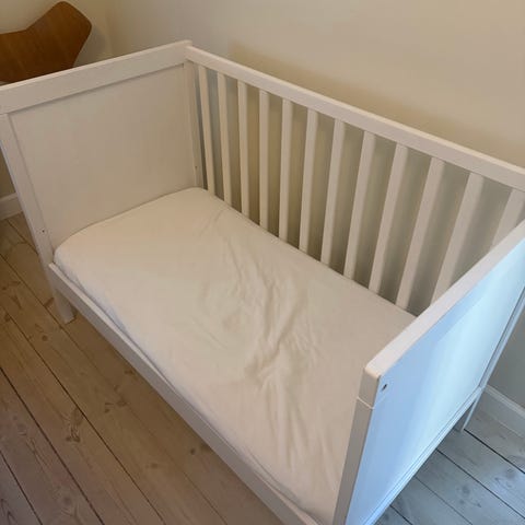 Tremmeseng fra IKEA i hvid. Brugsspor som på billedet ikke for-søgt fjernet. Bunden kan indstilles i to højder. Derudover kan man bruge sengen som bedside crip, hvis den ene side tages af og bunden er høj. Sengen kan også bruges af børn i to-tre års alderen hvor man tager den ene side af og bunden er lav så kan barnet selv kravle ind og ud af sengen. Fra røg-, dyre- og parfumefrit hjem.