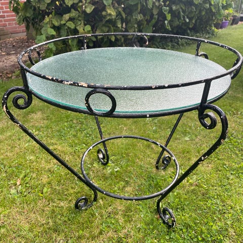 Tre forskellige blomsterborde i jern. Rundt med to hylder, men uden glas, diameter 65 cm, bredde 16 cm. Kr. 175. Lille firkantet med glasplade, 32x32x32 cm. Kr. 100. Lille trekantet opsats til potteplante, højde 35 cm. Kr. 50.