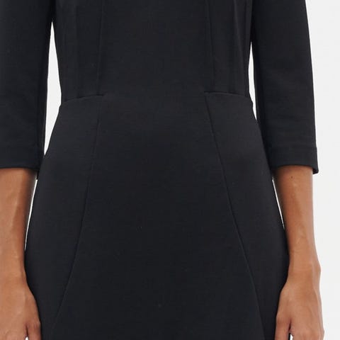 Ensfarvet løstsiddende sort kjole med læg ved den runde hals og på de 3/4 lange ærmer og to indvendige sidelommer. Lynlås i nakken/ryggen. Ingen fejl og mangler.