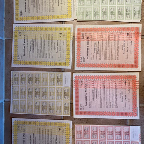 Aktiebrev fra Bestyrelsen for FYNBO-BRØD A/S, Bagermestrenes Brødfabrik Odense fra 1973 samt hertil hørende talon fra 1986-1992. Kr. 100,-