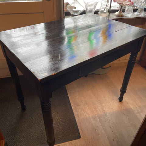 Gammelt køkken bord med slidt linoleum