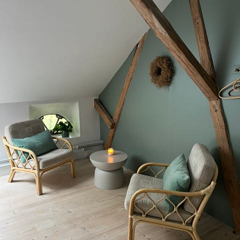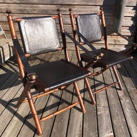 5 stk. meget fine velholdte lounge stole i bambus med hynder. Stolene er uden fejl og mangler, og står med den patina som tiden naturligt har givet dem. Hynderne bærer præg af let brug, men er uden skæmmende pletter o.a. Da 3 af stolene er opmagasineret, er kun 2 af stolene afbildet.