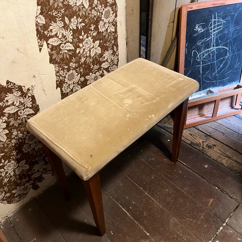 Klaverbænk polstret med flot stof. Benene kunne godt bruge en klat maling.