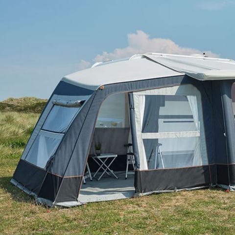 Isabellas store lufttelt i top-materialer som deres alm. telte, 4 meter bred x 2,75 meter dyb, venstre annex, bund med velcro til begge, 2 x veranda luftstænger, nyt gulvtæppe til hovedteltet, metalstænger til at holde tæt mod vognen, elektrisk Isabella pumpe, div. pløkker og barduner.