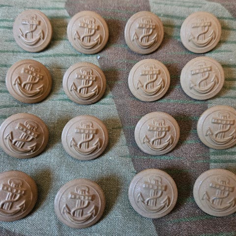 Original tysk Kriegsmarine-uniformsknap fra 1939, brugt af den tyske flåde under Anden Verdenskrig. Forgyldt messing med anker- og tovværksmotiv på forsiden. Bagsiden stemplet med “KRIEGSMARINE”, Marineabnahme-mærke (M i diamant), producentkode 79 og årstal 39.